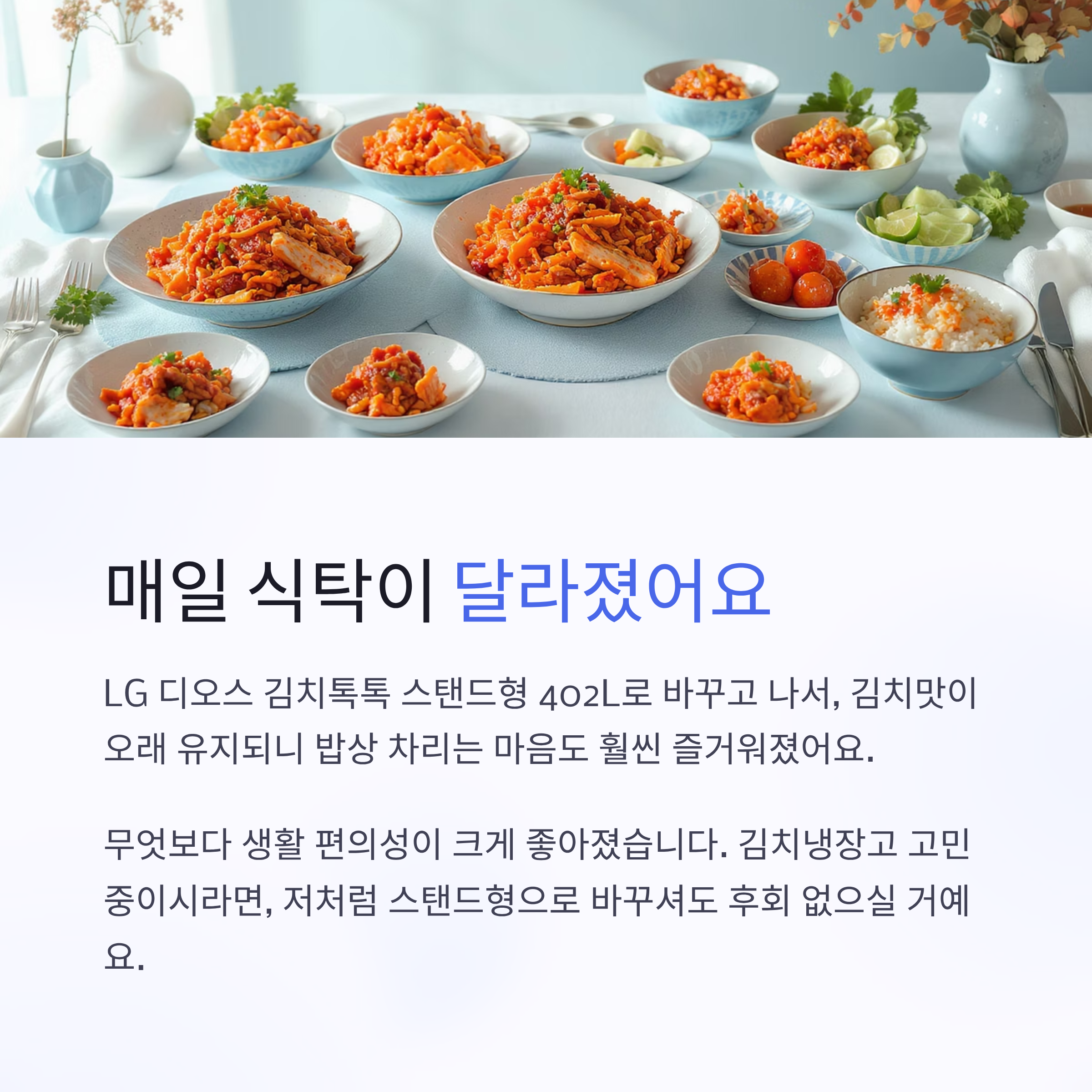 이번에 LG 디오스 김치톡톡 스탠드형 402L로 바꾸고 나서, 매일 식탁이 달라졌어요. 김치맛이 오래 유지되니 밥상 차리는 마음도 훨씬 즐거워졌고, 무엇보다 생활 편의성이 크게 좋아졌습니다.