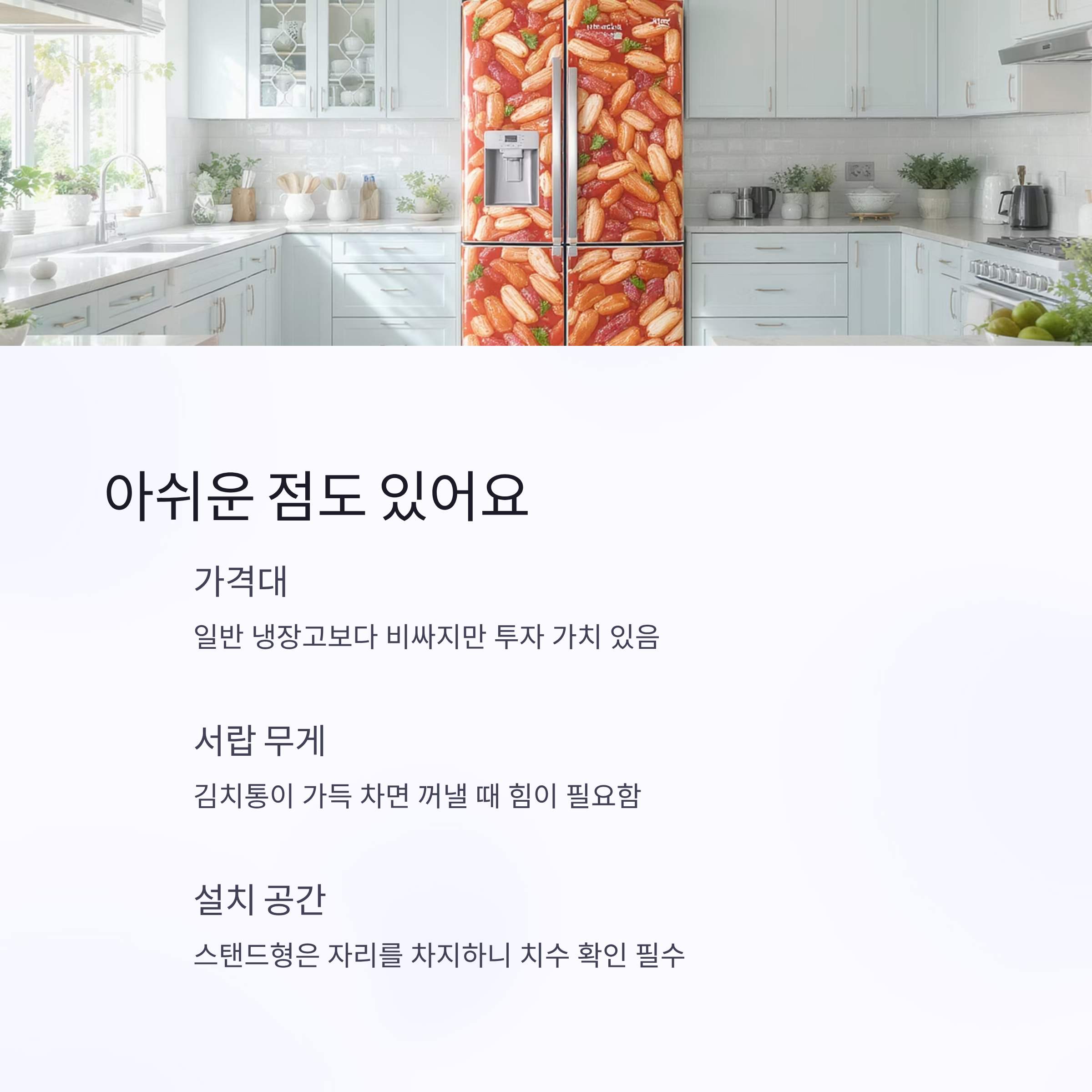아무리 만족스러워도 단점이 없을 순 없죠. 우선, 김치냉장고 가격대가 조금 있는 편이에요. 일반 냉장고랑 비교하면 “꼭 필요할까?” 고민할 수 있는데, 직접 써보니 투자할 가치가 있긴 했습니다.
