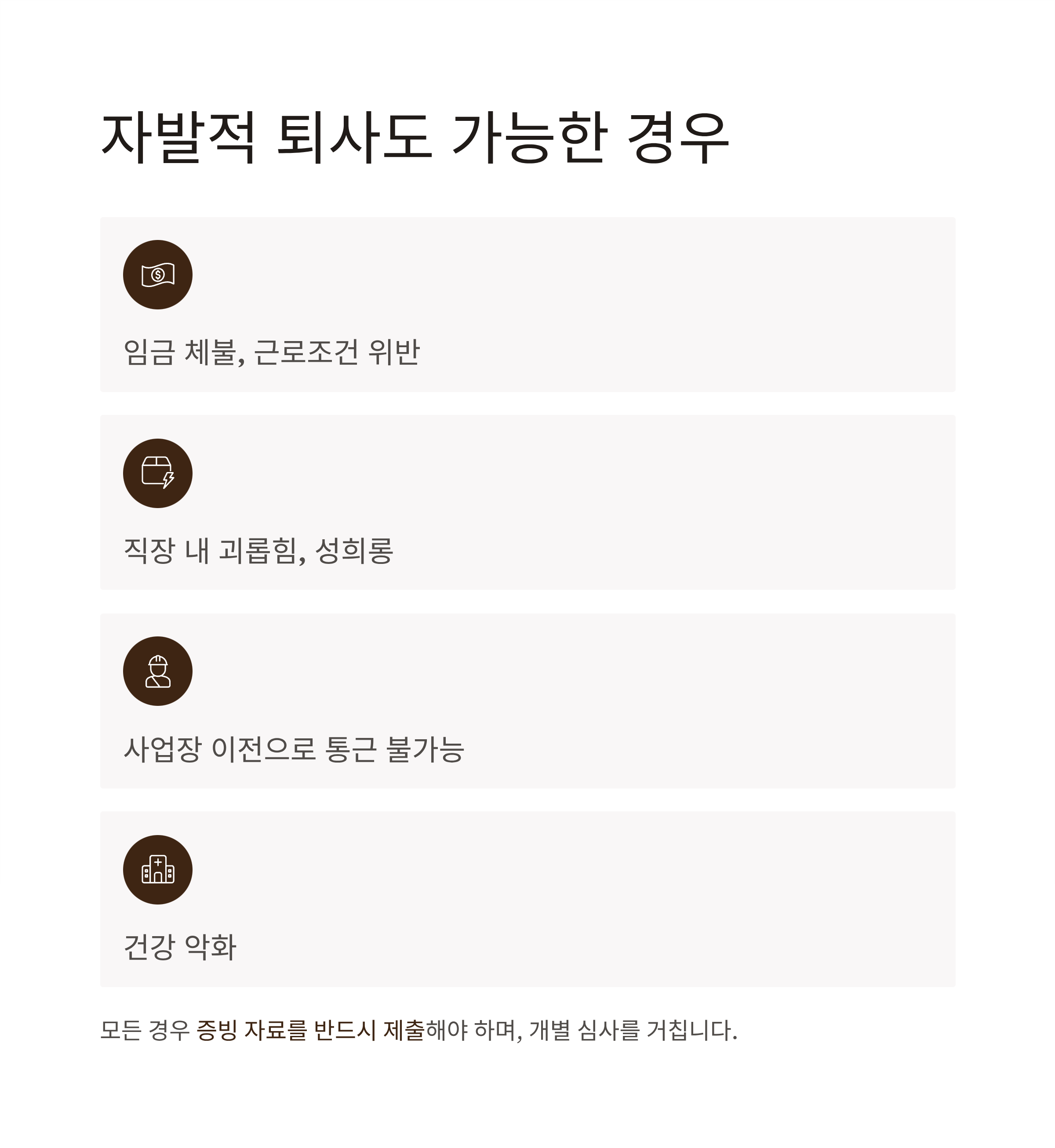 - 자발적 퇴사의 경우 일부 예외 사유에 해당해야 함