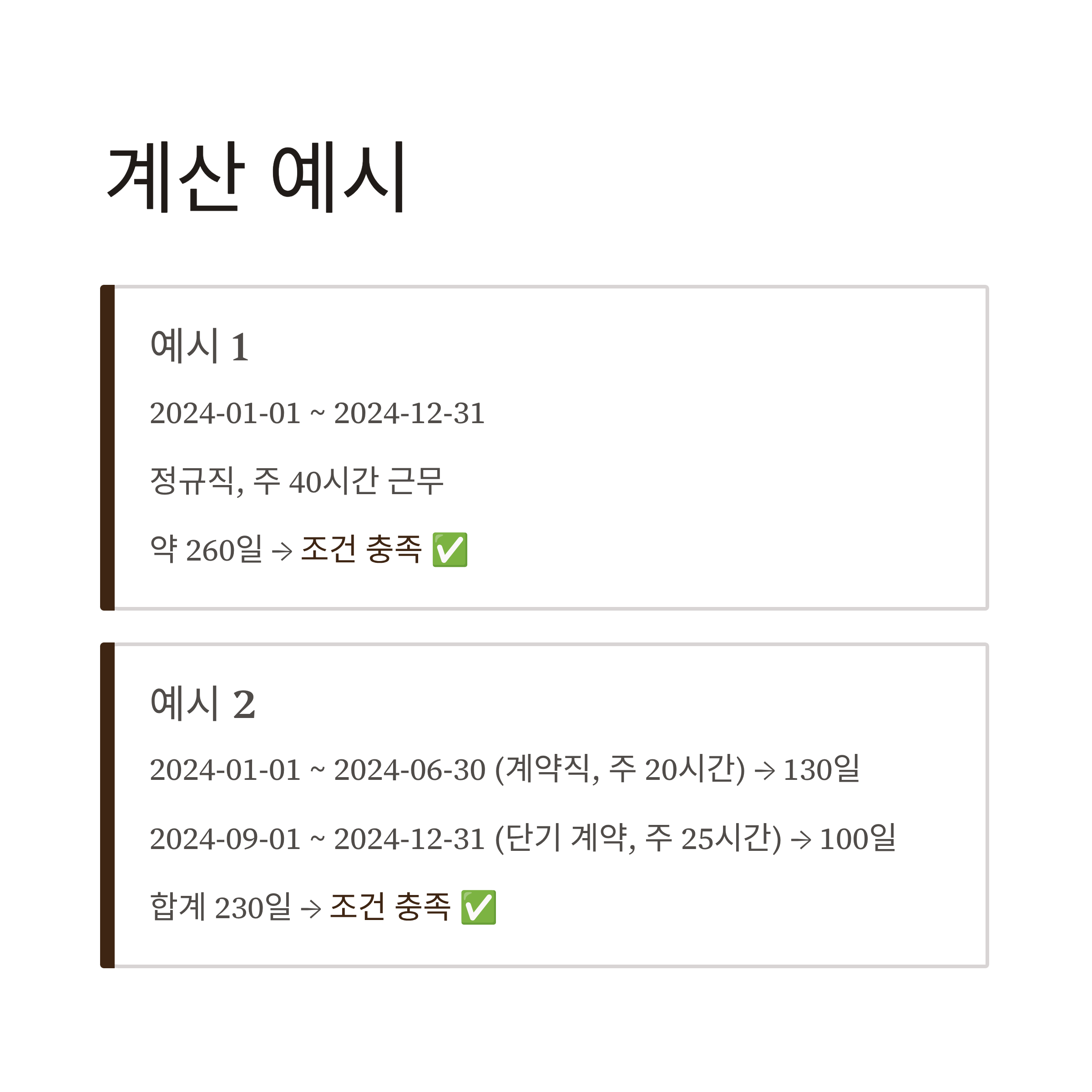 - 2024-01-01 ~ 2024-12-31(정규직, 주 40시간) → 약 260일 → 조건 충족 ✅