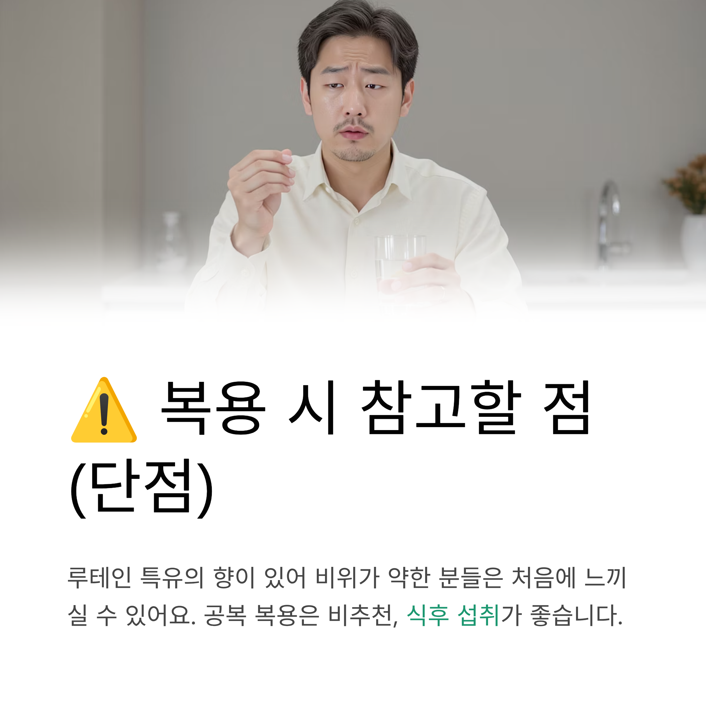 - 루테인 특유의 향: 비위가 약한 분들은 처음에 약간 느끼실 수 있어요. 물과 함께 바로 넘기면 무난합니다.