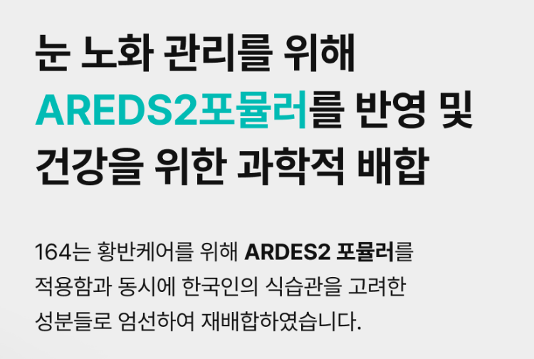 이 제품의 가장 큰 특징은 ‘164 포뮬러’라는 성분 배합입니다. 루테인 16mg + 지아잔틴 4mg 비율로, 황반 색소의 주요 구성 성분을 균형 있게 담고 있어 눈 건강에 효과적입니다.