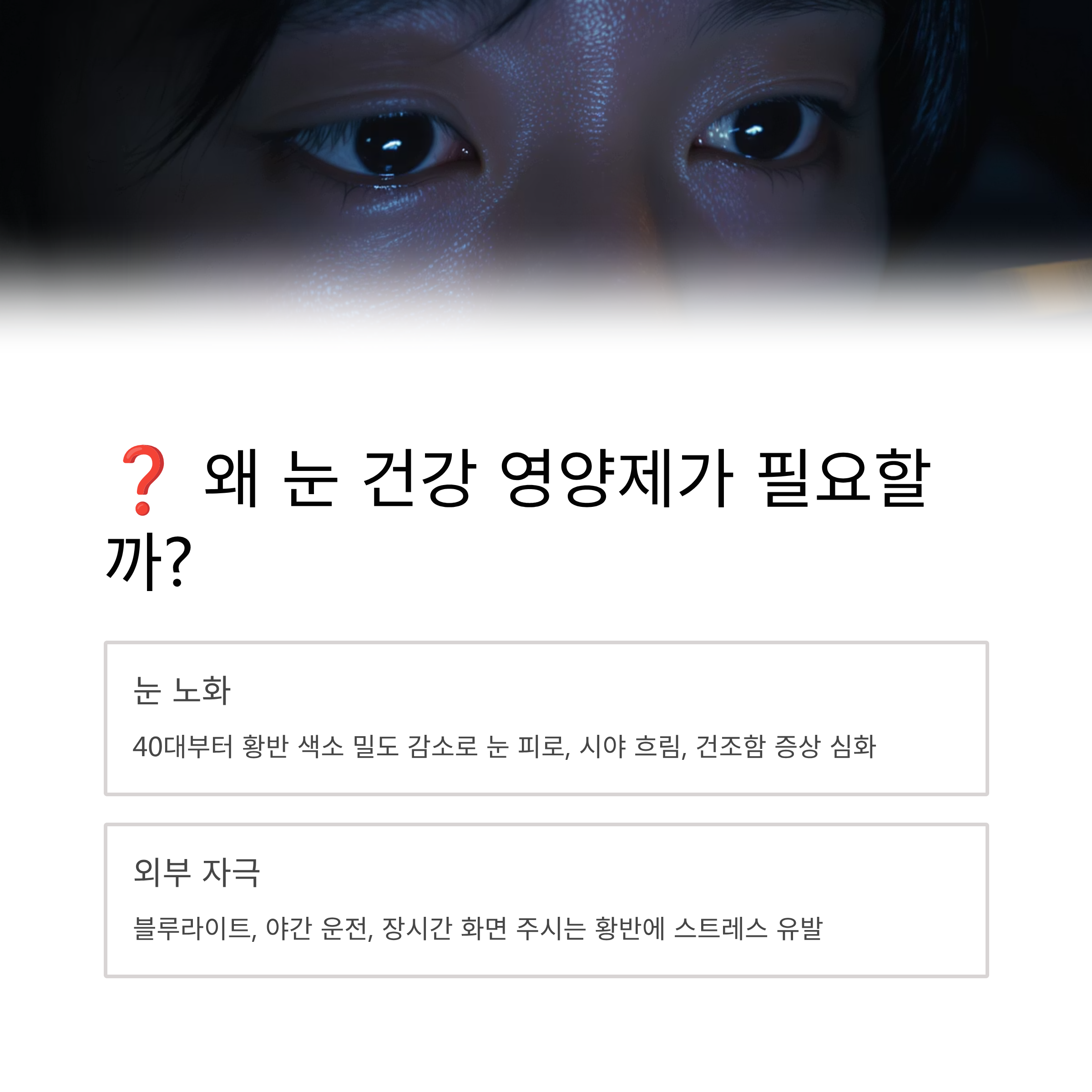 사람의 눈은 40대를 지나면서부터 황반 색소 밀도가 감소하고, 이에 따라 눈의 피로, 시야 흐림, 건조함 같은 증상들이 점점 심해질 수 있습니다. 특히 블루라이트, 야간 운전, 장시간 화면 주시 등은 황반에 더 큰 스트레스를 주게 되죠.