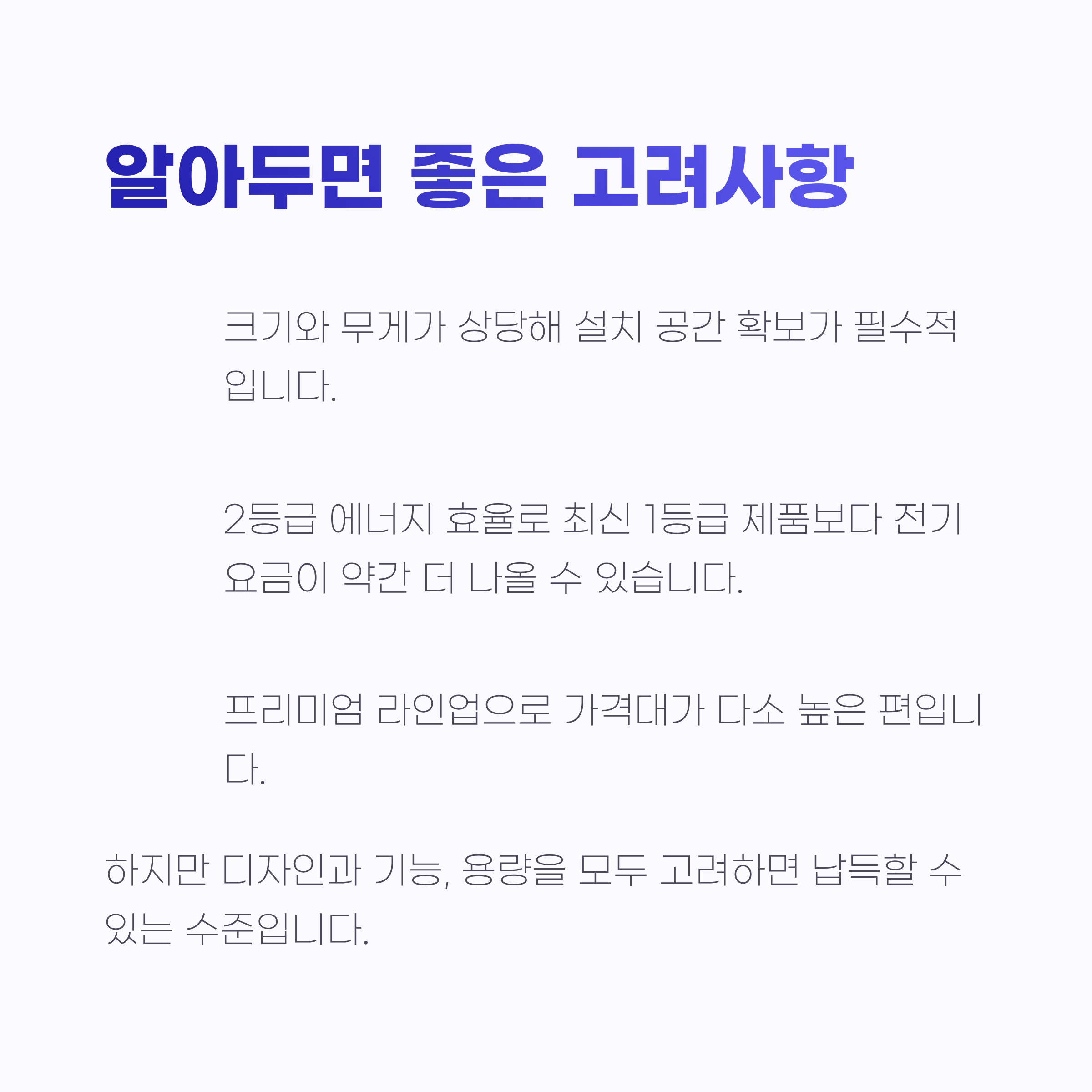 셋째, 브랜드 신뢰도입니다. LG는 사용해본 경험상 내구성과 서비스가 안정적이라는 확신이 있어요. 장기간 사용하는 대형 가전은 결국 AS와 신뢰도가 결정적인데, 이 부분에서 안심이 됐습니다.
