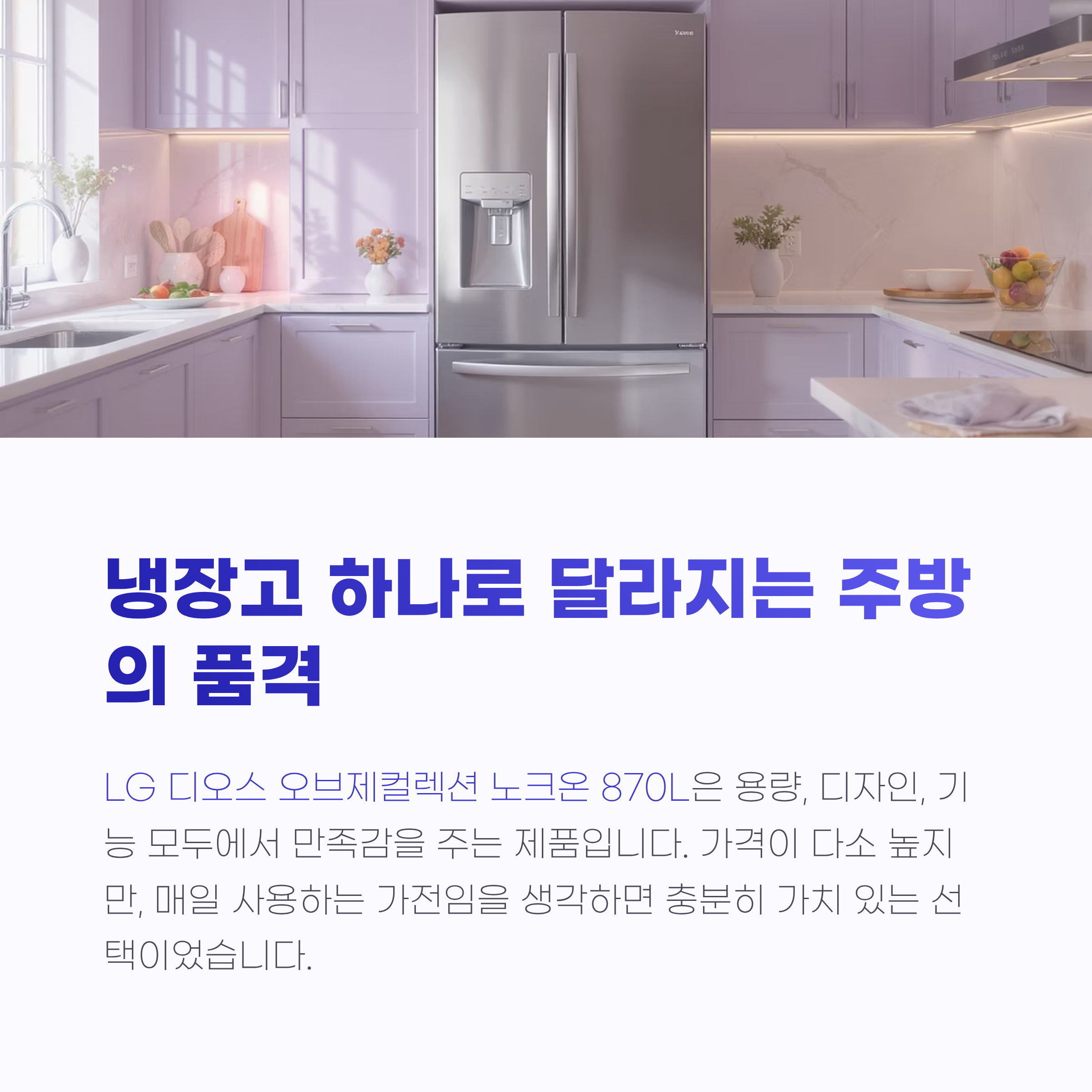 냉장고는 단순히 음식을 보관하는 공간을 넘어서, 가족의 건강과 식탁의 풍성함을 책임지는 중요한 가전입니다. 저는 이 점에서 LG 디오스 오브제컬렉션 노크온 870L이 최고의 선택이었다고 생각해요.